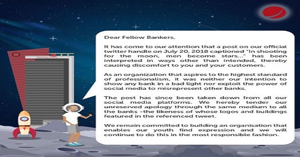 “Our apologies go out to all the banks -the likeness of whose logos & buildings featured in a post which we have since deleted. We remain committed to building an organisation that enables our youth find expression & we will continue to do this in the most responsible fashion.